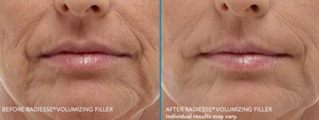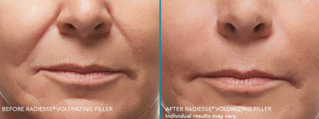 Radiesse is a safe and natural cosmetic dermal filler that restores volume and fullness to the skin to correct moderate to severe facial wrinkles and folds, such as nasolabial folds. With RADIESSE® wrinkle filler, you welcome back your own natural collagen to smooth out the signs of aging. That’s because RADIESSE wrinkle filler’s stimulates collagenesis – the production of new collagen – which results in increased volume for natural looking wrinkle correction that may last a year or more in many patients.
